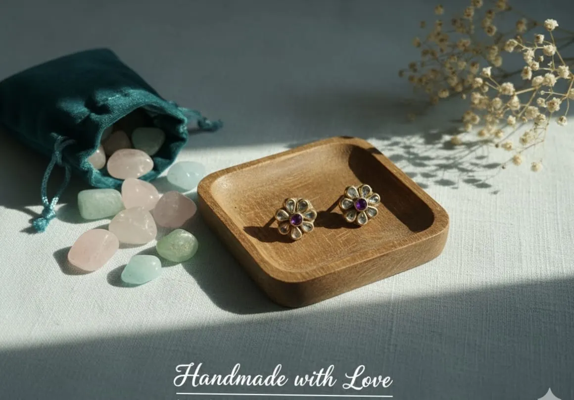 • Stones: Clear polki-style rhinestones and a central deep purple/amethyst gem.